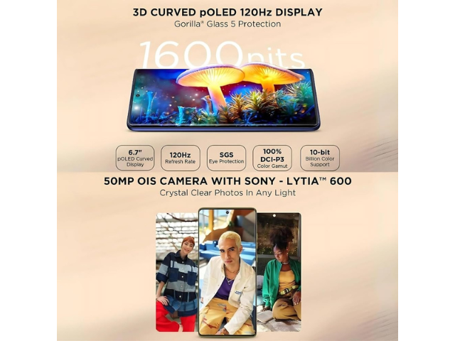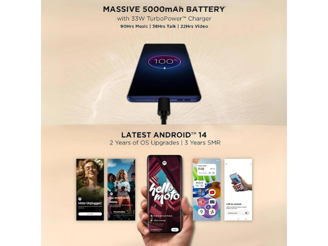 Discover the Moto G85 5G, which has a revolutionary 3D Curved pOLED 120 Hz Display protected by Gorilla Glass 5 for remarkable longevity. With the 50 MP OIS LYTIA 600 Camera system, you can take beautiful pictures in any kind of illumination. Utilise Smart Connect to share content with ease and make use of the built-in 8 GB RAM and 128 GB storage. Immersive sound is produced by its Dolby Atmos Dual Stereo Speakers, and its Snapdragon 6s Gen 3 engine lightning-fast 5G speeds over 13 bands. Android 14 delivers the newest advancements in mobile technology and security, with a 5000 mAh battery and 33 W TurboPower charging.