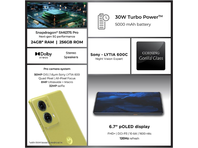 Discover the Moto G85 5G, which has a revolutionary 3D Curved pOLED 120 Hz Display protected by Gorilla Glass 5 for remarkable longevity. With the 50 MP OIS LYTIA 600 Camera system, you can take beautiful pictures in any kind of illumination. Utilise Smart Connect to share content with ease and make use of the built-in. Immersive sound is produced by its Dolby Atmos Dual Stereo Speakers, and its Snapdragon 6s Gen 3 engine guarantees lightning-fast 5G speeds over 13 bands. Android 14 delivers the newest advancements in mobile technology and security, with a 5000 mAh battery and 33 W TurboPower charging.